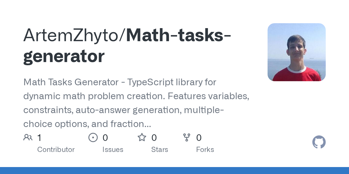 Math Tasks Generator - TypeScript library for dynamic math problem creation. Features variables, constraints, auto-answer generation, multiple-choice options, and fraction support. Perfect for educational platforms.